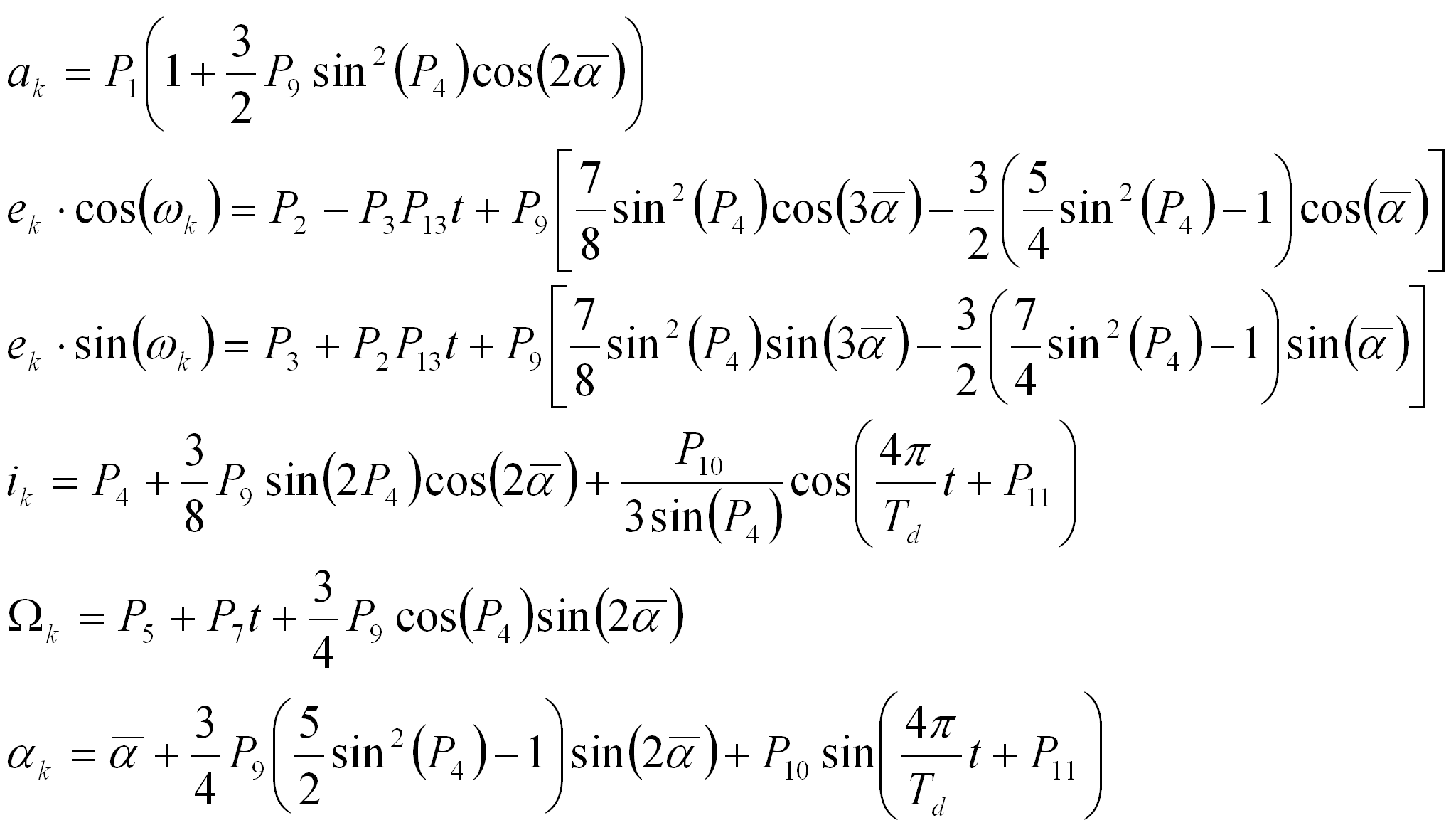 The model itself is defined by the following equations, working with t (time since epoch), first compute the 'mean' mean argument latitude (without the short term gravitational perturbations) from: